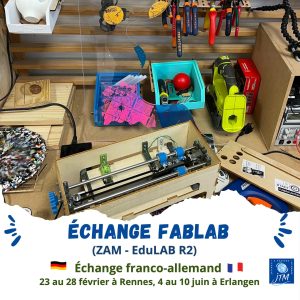 Tu as entre 18 et 26 ans, tu fréquente les fablabs ou bricole dans ton atelier perso et tu as envie de partager cela avec des homologues allemand. Jeunes à Travers le Monde et l’Edulab Rennes 2 te propose un échange inter-culturel sur 2 semaine les 23 au 28 février à Rennes puis 4 au 10 juin à Erlangen.